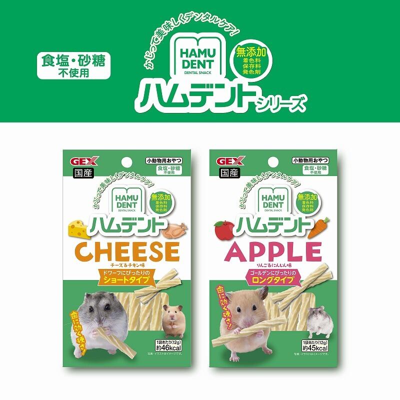 ・ハムデントはハムスターの前歯(切歯)が伸び続ける習性を考えたデンタルケアおやつです。かじることで歯の健康やストレス解消に。